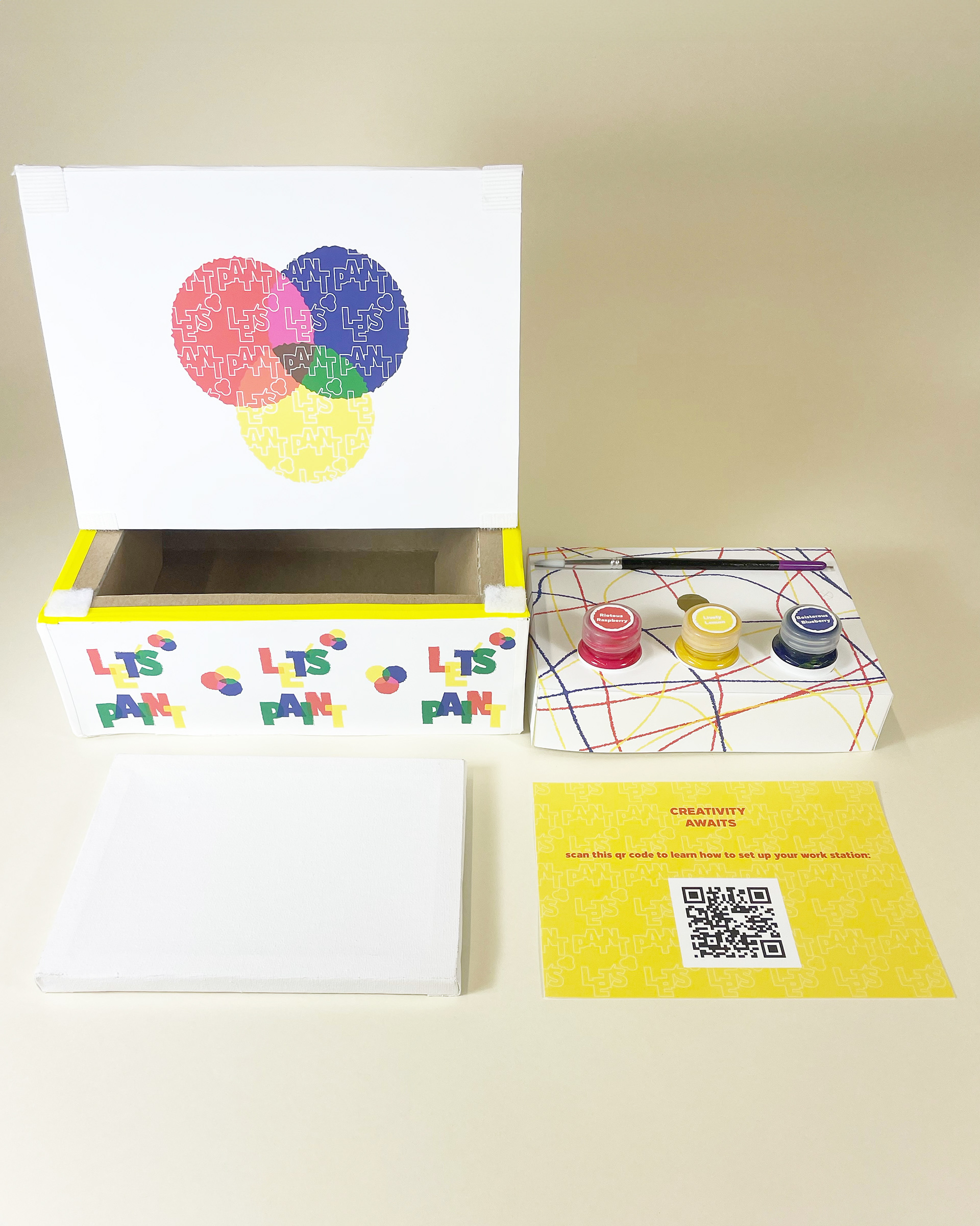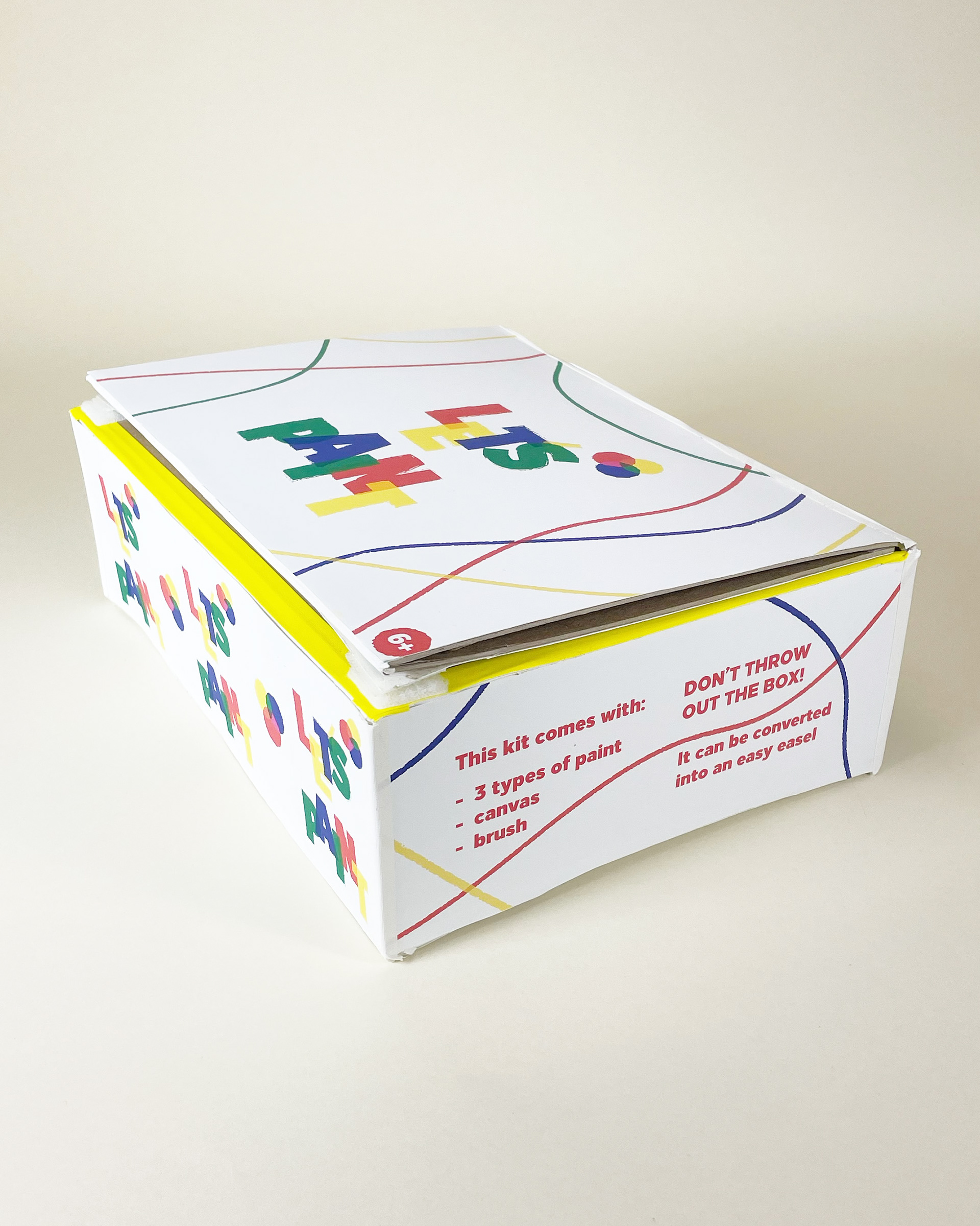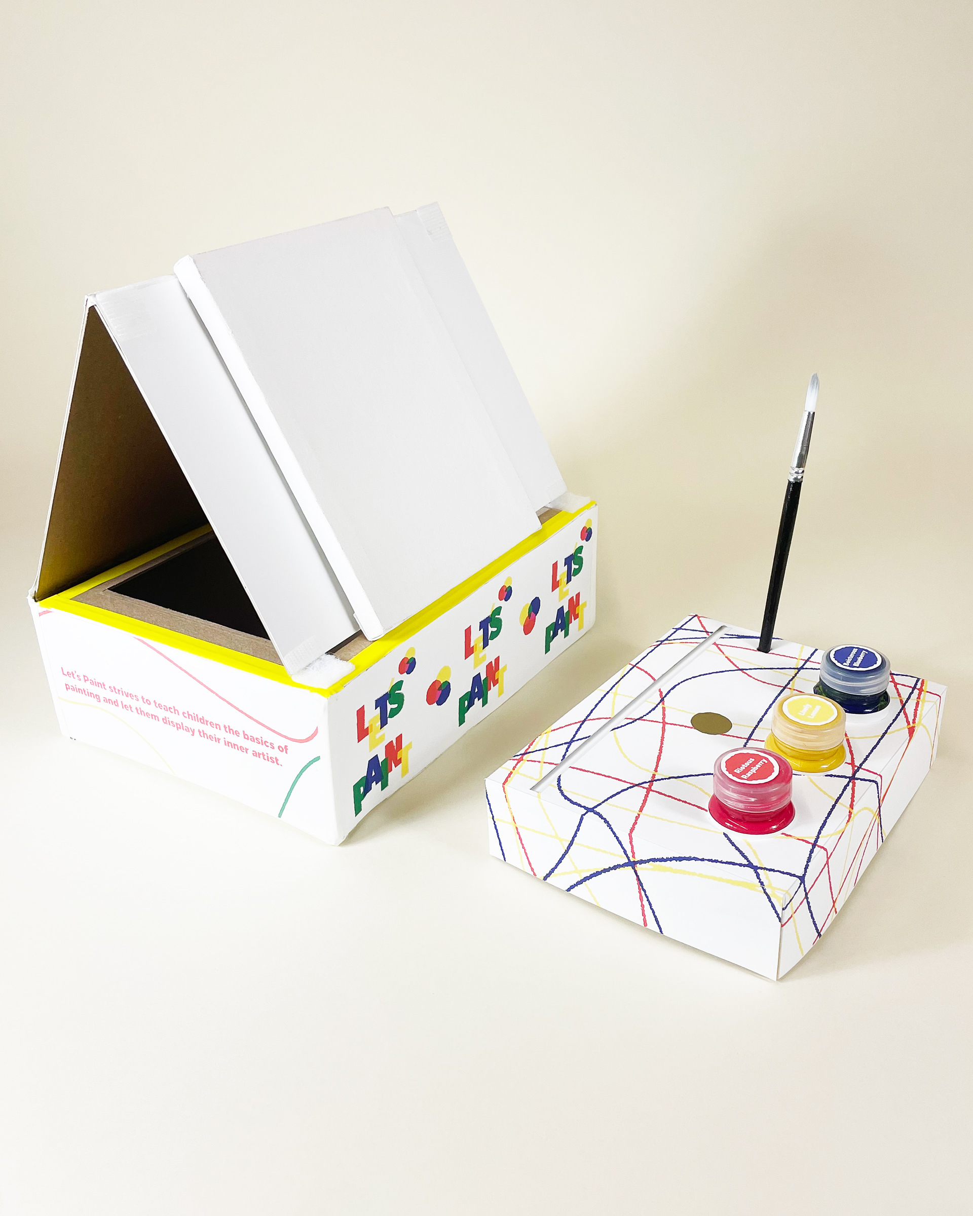 Let's Paint! is a painting kit for children that teaches them the basics of painting and color theory. The kit contains a canvas, a brush, and three different paints. The packaging holds a dual purpose and can easily be converted into an easel.